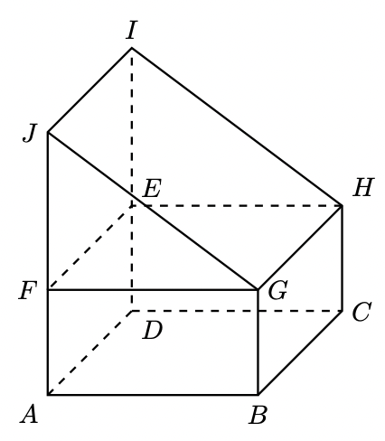 O volume do sólido $[A B C D I J G H]$ pode ser obtido pela soma dos volumes do prisma de bases quadradas $[A B C D E F G H]$ e do prisma triangular $[E F G H I J]$ :
