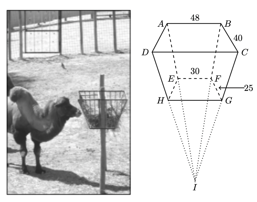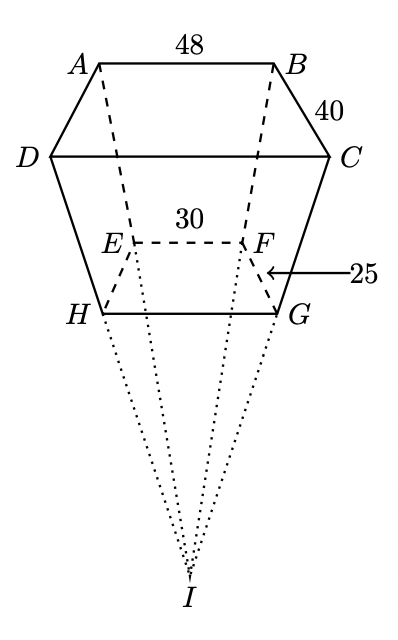 - a altura da pirâmide $[A B C D I]$ é $80 \mathrm{~cm}$, e a altura do tronco de pirâmide é $30 \mathrm{~cm}$.