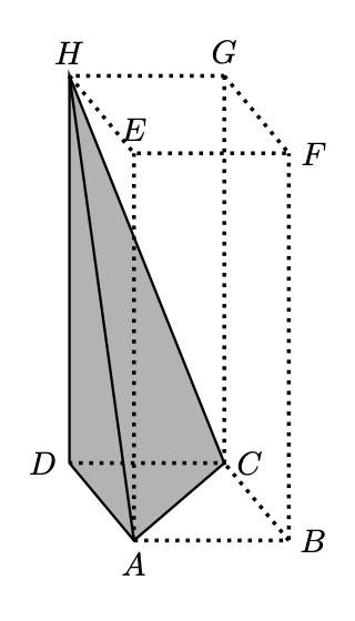 $$V_{[A C D H]}=\frac{1}{3} \times A_{[A C D]} \times \overline{D H}=\frac{1}{3} \times 2 \times 5=\frac{10}{3} \approx 3,3 \mathrm{~m}^{3}$$
