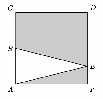 A área da região sombreada pode ser calculada como a diferença das áreas do quadrado $[A C D F]$ e do triângulo $[A B E]$