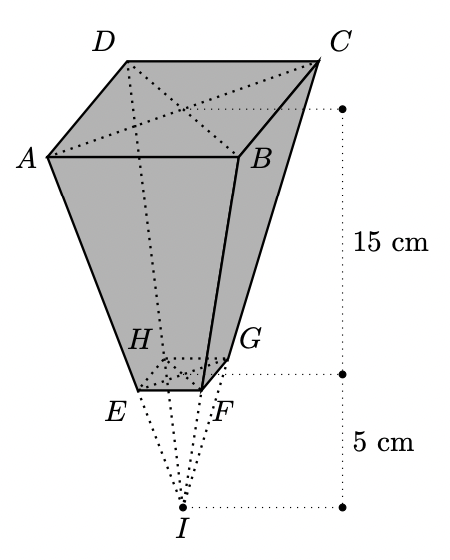 e que a altura da pirâmide de base $[A B C D]$ e vértice $I$ é $20 \mathrm{~cm}$.