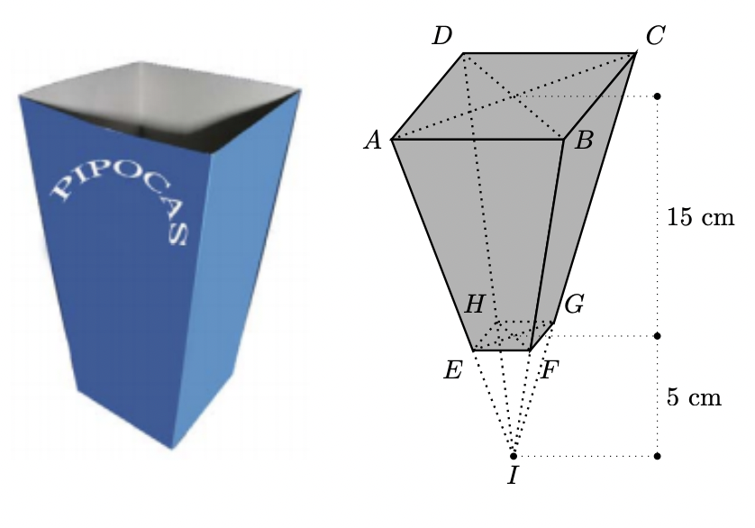 Na figura seguinte, à esquerda, podes observar um pacote de pipocas cujo modelo geométrico é um tronco de pirâmide, de bases quadradas e paralelas, representado a sombreado na figura da direita.