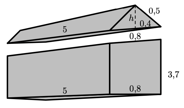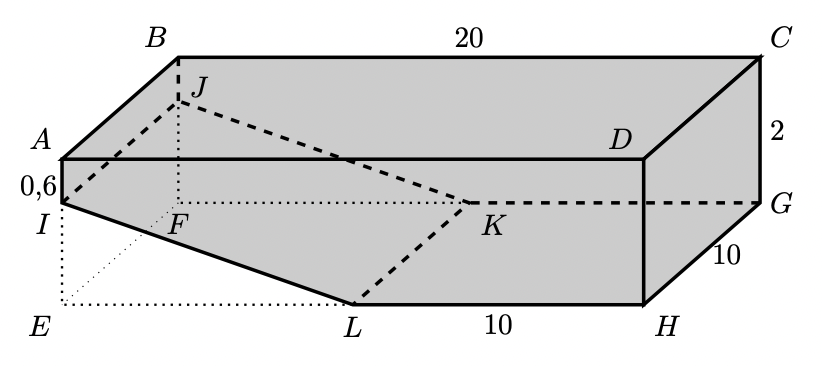 Como a altura do prisma triangular é $$\overline{E F}=\overline{H G}=10 \mathrm{~m}, \overline{E L}=\overline{E H}-\overline{L H}=20-10=10 \mathrm{~m} \mathrm{~e~}\overline{E I}=\overline{E A}-\overline{I A}=2-0,6=1,4 \mathrm{~m}$$ Temos que, o volume do prisma triangular [IELJFK] é: