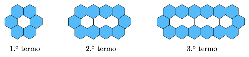 Na figura seguinte, estão representados os três primeiros termos de uma sequência formada por hexágonos regulares iguais.