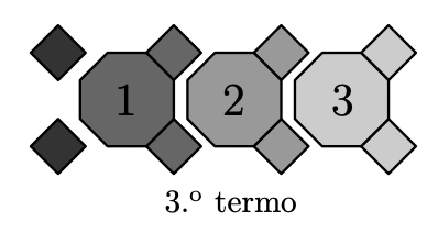 Como o primeiro termo tem 1 octógono e 4 quadrados (ou seja $2+2$ ), cada termo terá um número de octógonos igual à ordem do termo e um número de quadrados que é o dobro do número de óctogonos acrescido de duas unidades.