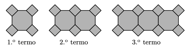 O primeiro termo da sequência é composto por um octógono e por quatro quadrados. Cada um dos restantes termos obtém-se acrescentando ao termo anterior um octógono e dois quadrados.