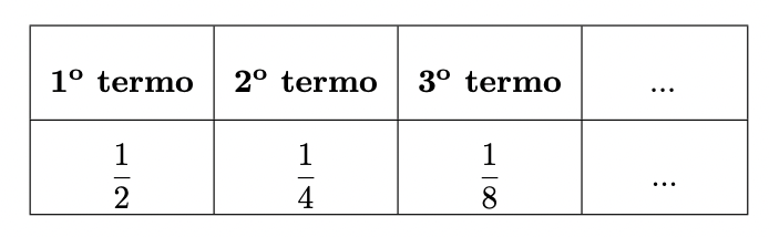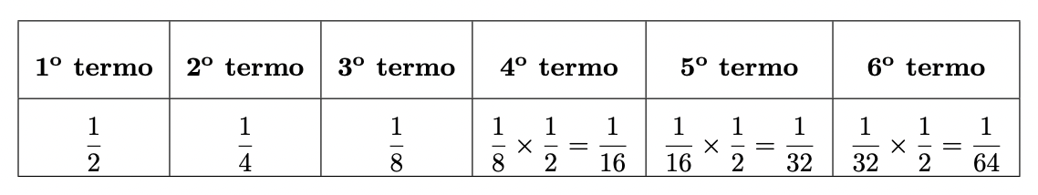 Na tabela seguinte, estão indicados os três primeiros termos de uma sequência de números racionais. Cada termo desta sequência, com exceção do primeiro, obtém-se multiplicando o termo anterior por $\frac{1}{2}$.
