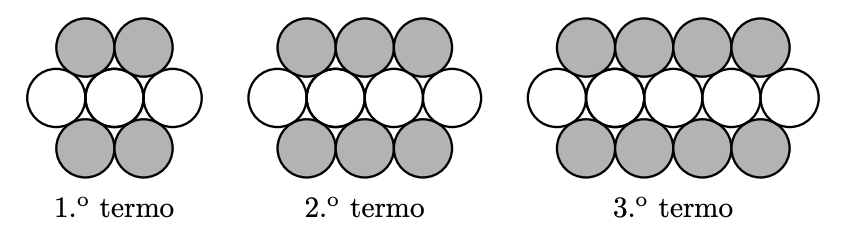 Representam-se a seguir os três primeiros termos de uma sucessão de figuras constituídas por círculos geometricamente iguais. Com exceção do primeiro, cada termo da sucessão tem mais um círculo branco e dois círculos cinzentos do que o termo anterior.