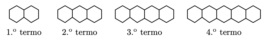 Representam-se a seguir os quatro primeiros termos de uma sucessão de figuras constituídas por hexágonos regulares geometricamente iguais. Com exceção do primeiro, cada termo da sucessão tem mais um hexágono do que o termo anterior.