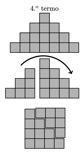 O que nos permite conjeturar que esta sequência é a sequência dos quadrados perfeitos... com efeito, é possível fazer um arranjo dos quadrados de cada termo da sequência no sentido de verificar que no termo de ordem $n$, temos exatamente $n^{2}$ quadrados (como na figura).