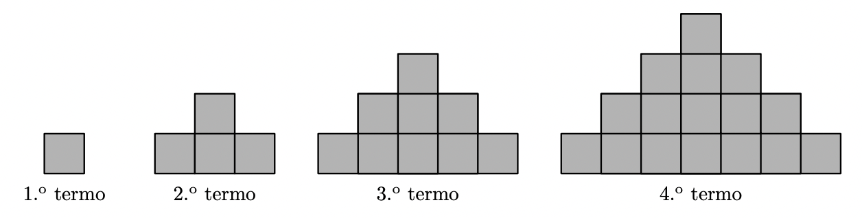 Na figura seguinte, estão representados os quatro primeiros termos de uma sequência de figuras, constituídas por quadrados geometricamente iguais, que segue a lei de formação sugerida.