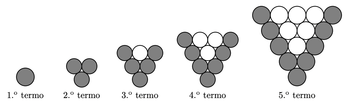 Os dois primeiros termos são formados só por círculos pretos. Os restantes são formados por círculos pretos e círculos brancos.
