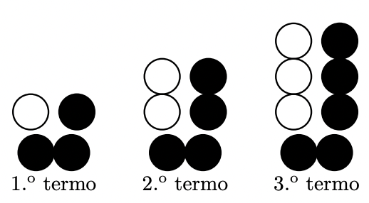 Considerando separadamente as duas bolas pretas da linha inferior, e as restantes separadamente, podemos ver que no termo de ordem $n$, existem $n$ bolas brancas, $n$ bolas pretas e ainda as duas bolas pretas da linha inferior.