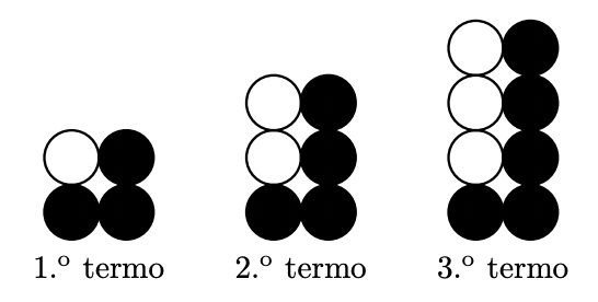 Assim, para construir o $7 .^{\circ}$ termo da sequência, são necessárias 7 bolas brancas, mais 7 bolas pretas (dispostas ao lado das brancas) e mais duas bolas pretas (colocadas em baixo), ou seja, um total de