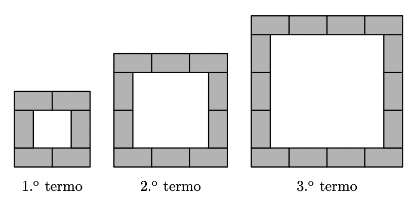 Observando os primeiros 3 termos da sequência, é possível verificar que em cada termo são acrescentadas 4 peças retangulares ao termo anterior (uma em cada lado do quadrado).