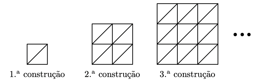 O Pedro, na aula de Matemática, construiu a sequência de quadrados da figura seguinte. Os quadrados são formados por triângulos geometricamente iguais ao triângulo ⊿. A $1 .^{\mathrm{a}}$ construção é formada por 2 triângulos, a $2 .^{\mathrm{a}}$ construção é formada por 8 triângulos, a $3 .^{\mathrm{a}}$ construção é formada por 18 triângulos e assim sucessivamente.