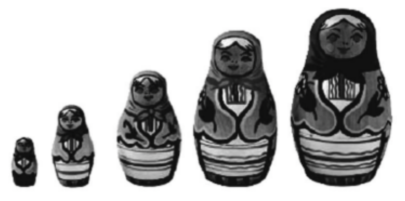 Uma matrioska é um brinquedo tradicional da Rússia, constituído por uma série de bonecas que são colocadas umas dentro das outras.