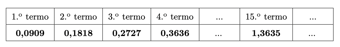 Como cada termo pode ser obtido adicionando ao anterior o valor 0,0909 , e o primeiro termo é também 0,0909, o termo de ordem $n$ é $n \times 0,0909$, porque resulta de adicionar $0,0909, n$ vezes. Assim calculando alguns termos da sequência, temos: