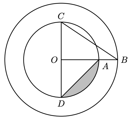 Na figura seguinte, estão representadas duas circunferências com centro no ponto $\mathrm{O}$, uma de raio $\overline{O A}$ e outra de raio $\overline{O B}$