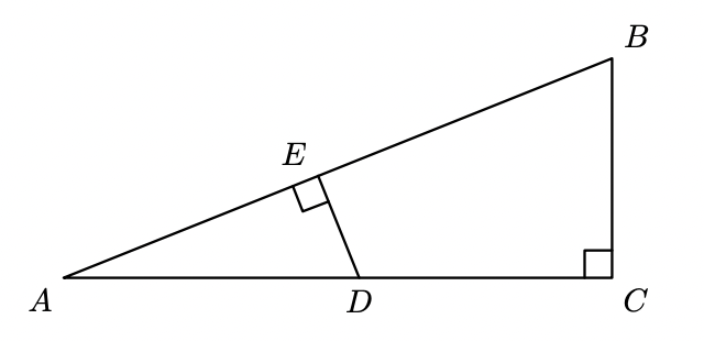 Como os triângulos $[A E D]$ e $[A C B]$ são semelhantes (porque têm um ângulo agudo em comum e os ambos têm um ângulo reto, logo têm dois pares de ângulos iguais dois a dois), podemos afirmar que a razão entre lados correspondentes é igual, ou seja