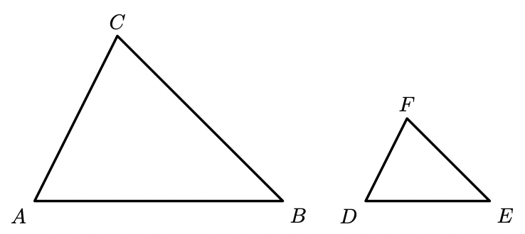 Na figura seguinte, estão representados dois triângulos semelhantes. O triângulo $[A B C]$ é uma ampliação do triângulo $[D E F]$
