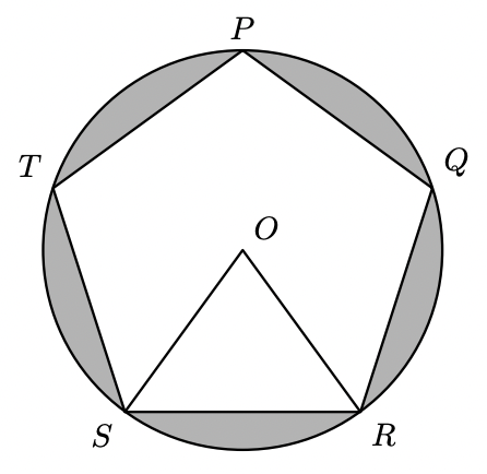Na figura está representado uma circunferência de centro $O$, em que está inscrito um pentágono regular $[P Q R S T]$.