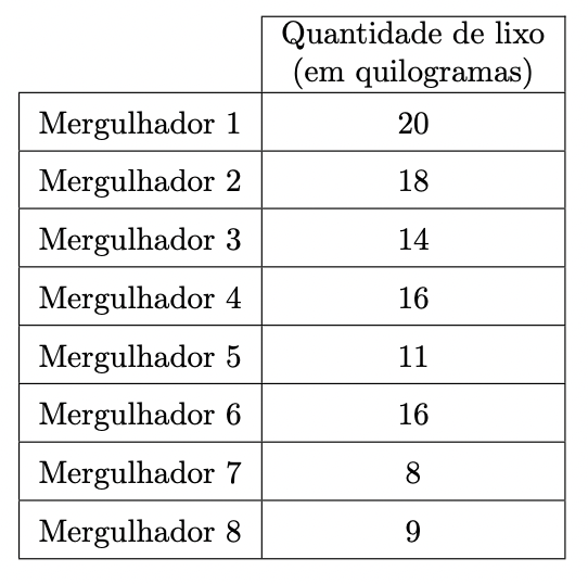 Na tabela, apresenta-se a quantidade de lixo, em quilogramas, que cada um dos oito mergulhadores recolheu.