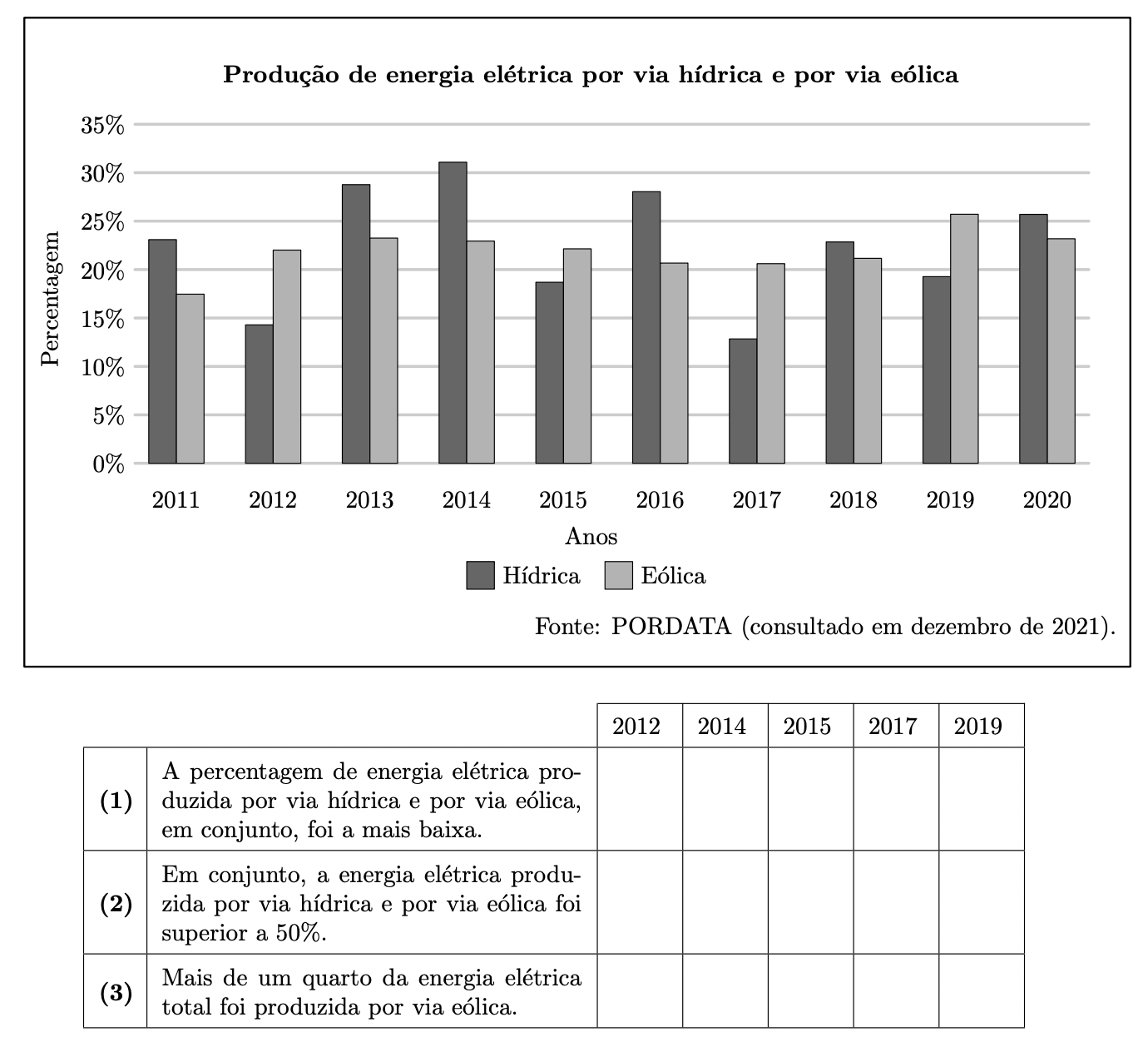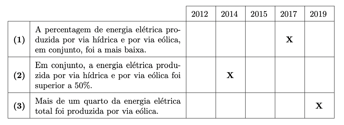 (2) A segunda linha refere-se também ao conjunto das percentagens de energia elétrica produzida por via hídrica e por via eólica, e pela observação do gráfico podemos observar que, nos anos constantes na tabela, foi em 2014, que a produção combinada das duas fontes foi superior a $50 \%$, porque a produção por via hídrica foi superior a $30 \%$ e a produção por via eólica foi superior a $20 \%$.