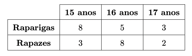 A turma da Ana tem 29 alunos, distribuídos, por género e por idade, de acordo com a tabela seguinte.