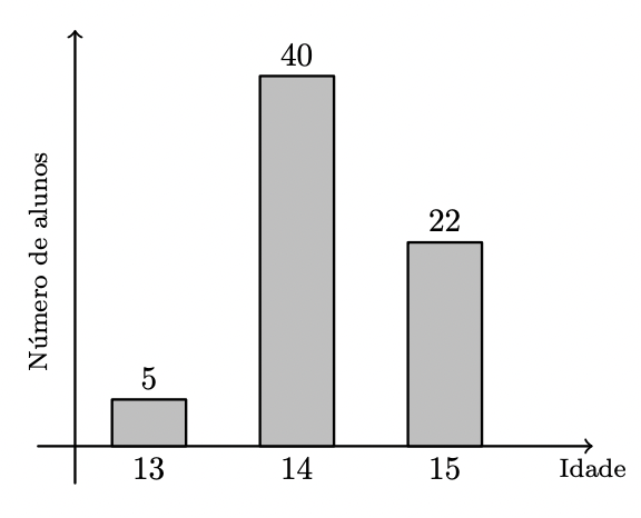 Como o valor calculado pela Inês para a média das idades é 14,5 , e pela observação do gráfico temos que existem 5 pessoas com 13 anos, 40 com 14 e 22 com 15, podemos calcular o número de pessoas com 16 anos:
