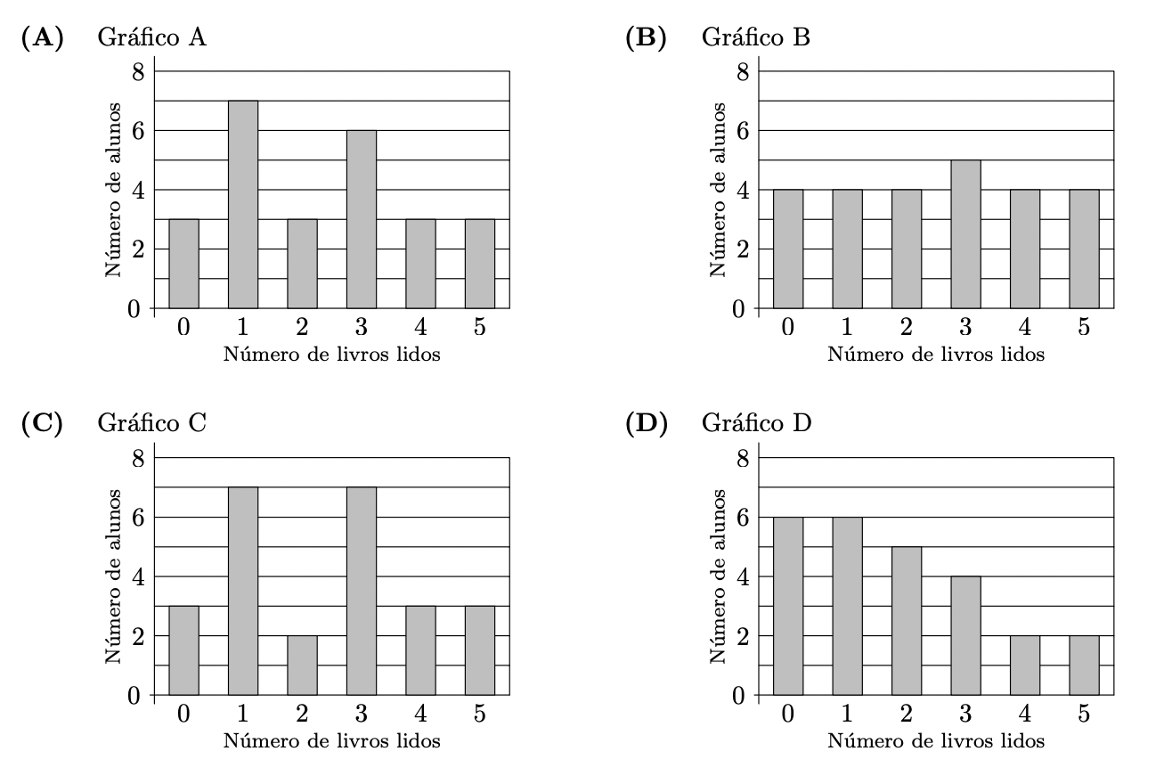 Qual dos seguintes gráficos pode traduzir corretamente os resultados do questionário, sabendo que a mediana do número de livros lidos nas férias pelos alunos da turma é igual a 3 ?