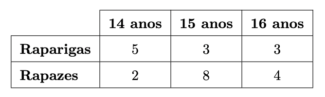 Uma turma de uma certa escola tem raparigas e rapazes com 14, 15 e 16 anos, que se distribuem, por idade e por sexo, como se apresenta na tabela seguinte.