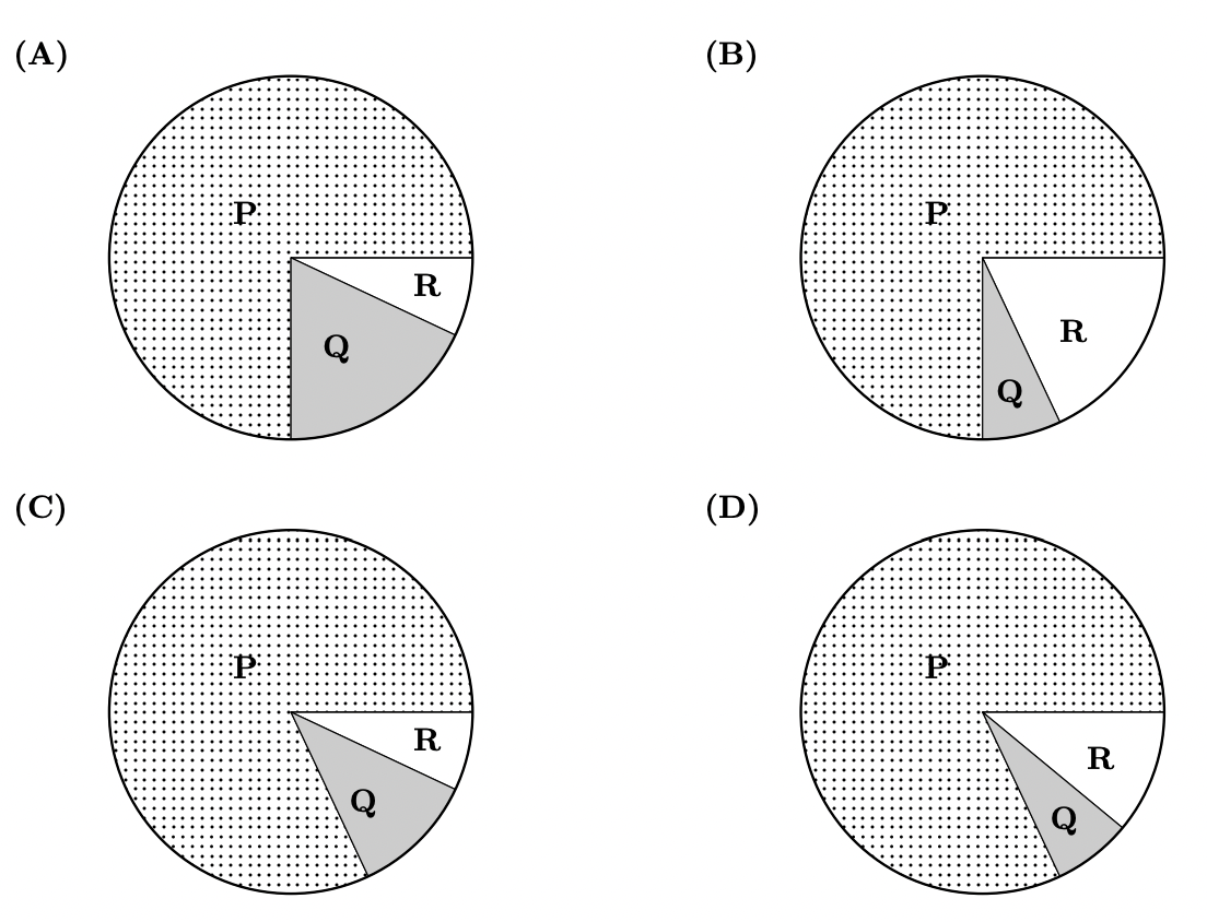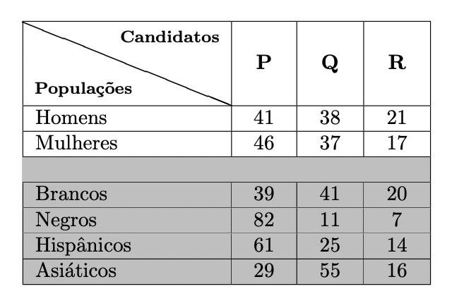 As letras $\mathbf{P}, \mathbf{Q}$ e $\mathbf{R}$ designam os três candidatos numa eleição nos Estados Unidos da América. A tabela seguinte apresenta as distribuições das percentagens de votos nesses candidatos.
