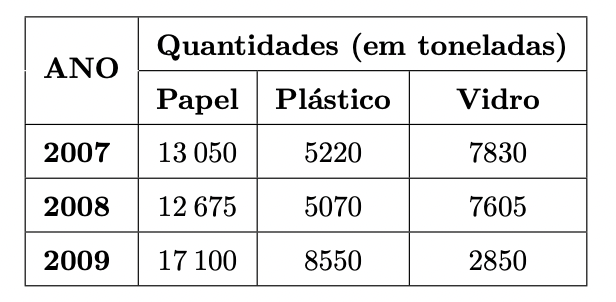 A tabela seguinte apresenta as quantidades, em toneladas, de papel, de plástico e de vidro recolhidas por uma empresa de reciclagem em 2007, 2008 e 2009.