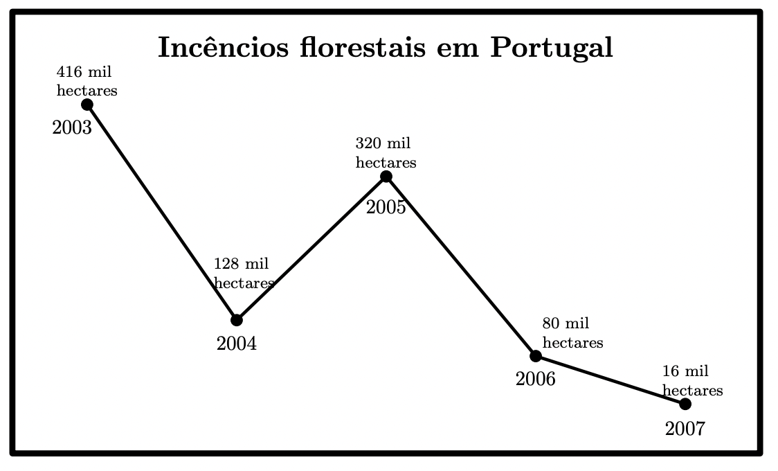 O gráfico seguinte mostra o número de hectares de floresta ardida, em Portugal Continental, entre os anos de 2003 e 2007.