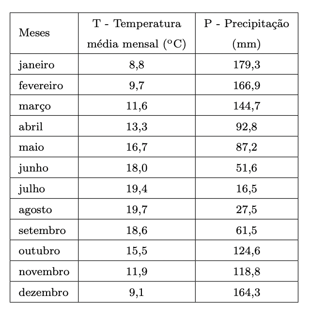 Segundo os meteorologistas, um mês considera-se seco se a precipitação total mensal (P), dada em milímetros, for inferior ao dobro do valor da temperatura média ( $\mathrm{T}$ ) desse mês, dada em graus centígrados $\left({ }^{\circ} \mathrm{C}\right)$, ou seja: