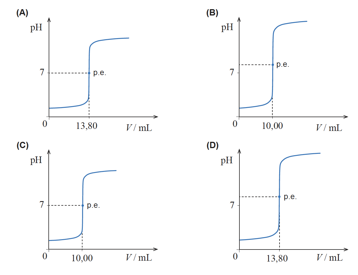 Selecione a opção que apresenta o esboço do gráfico que representa a curva da titulação, a 25 ºC.