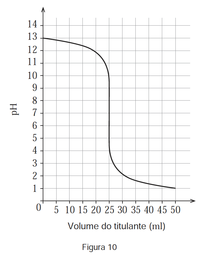 Uma solução aquosa de $80,0 \mathrm{ml}$ de $\mathrm{NaOH}\left(M=40,00 \mathrm{~g} \mathrm{~mol}^{-1}\right)$ foi preparada a partir de uma amostra impura do reagente sólido, da qual se gastou $1,20 \mathrm{~g}$. Retiraram-se $20,0 \mathrm{~ml}$ dessa solução e titulou-se esta quantidade de solução com a solução-padrão de $\mathrm{HCl}$, tendo-se obtido a curva de titulação representada na Figura 10.